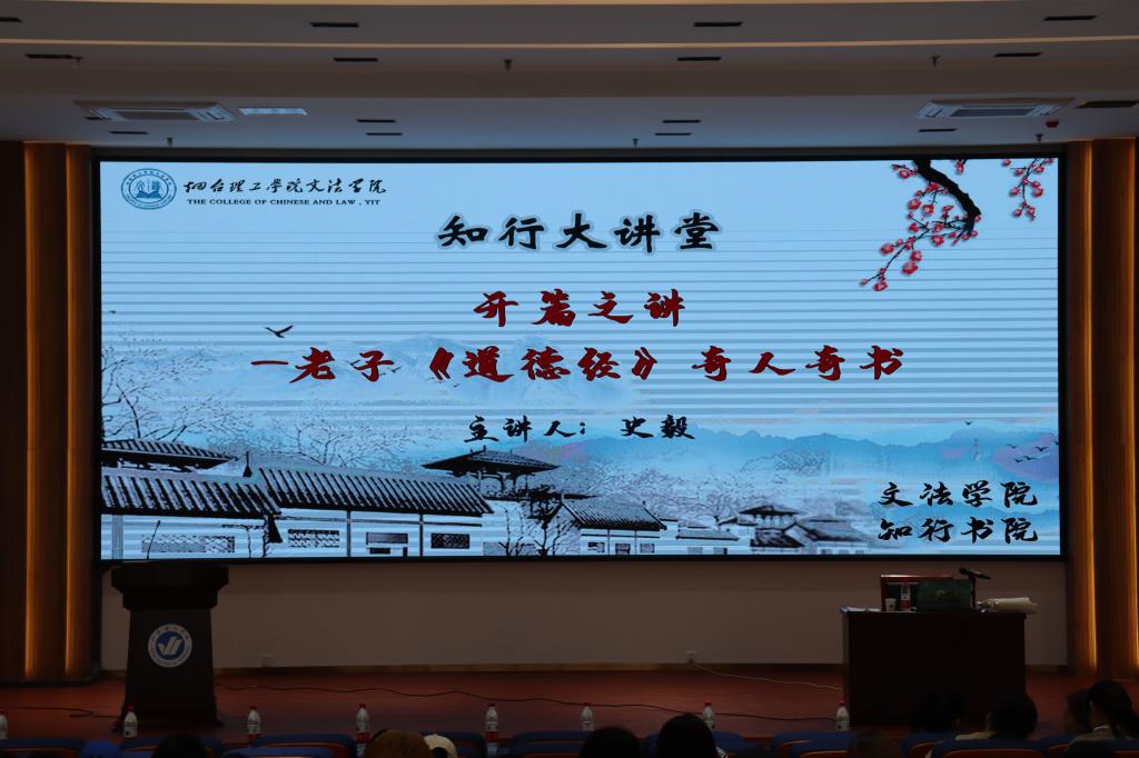9月27日下午,文法学院于三教六楼报告厅联合知行书院开展老子《道德经》及其人生智慧系列讲座。文法学院党总支副书记王晓黎、副院长林莎出席,学校教师代表及文法学院学生代表参加。本次讲座由烟台理工学院工会主席史毅主讲。